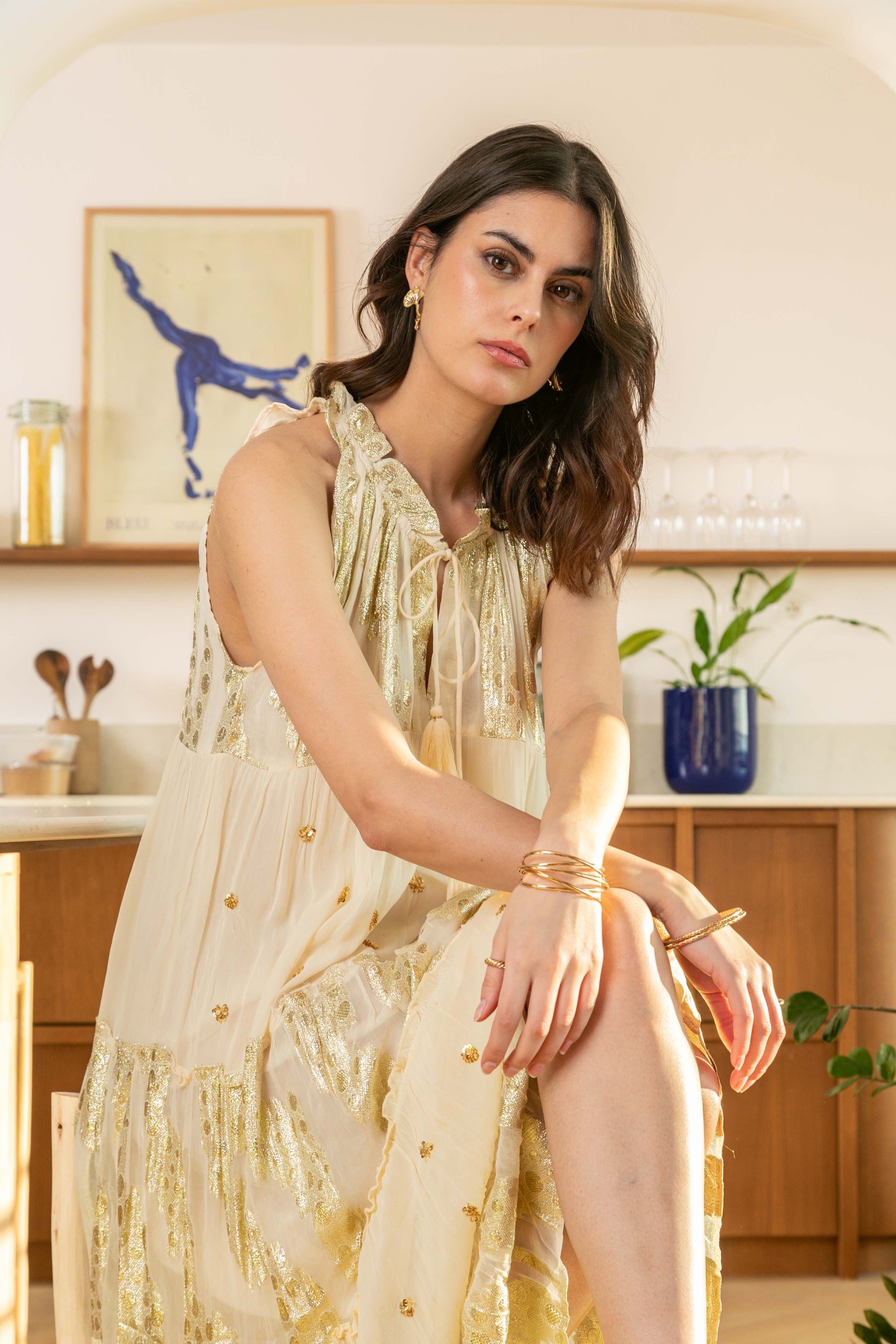 - Flowing tiered silhouette in a rich olive green with shimmering gold foil accents