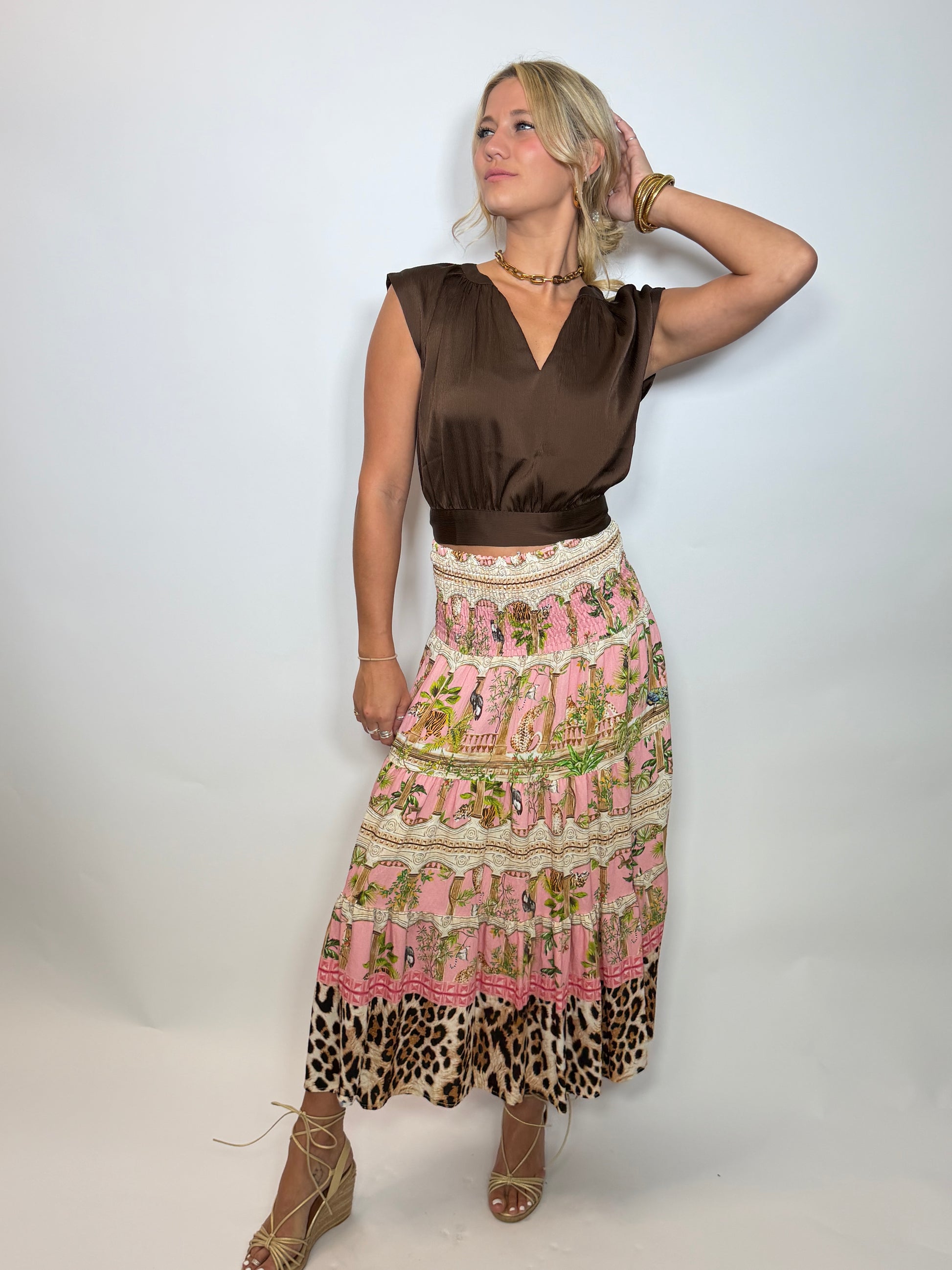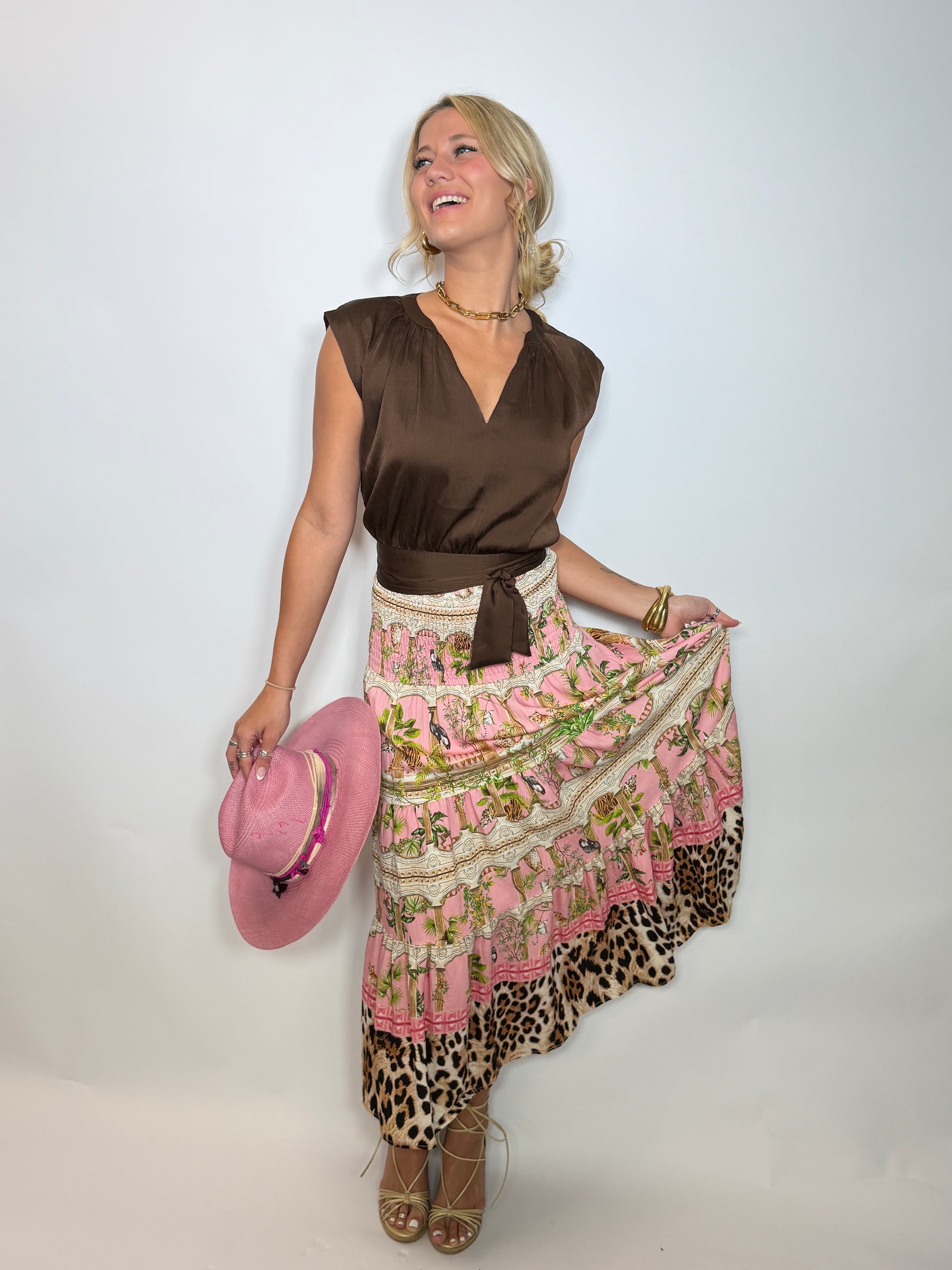 - Flowy tiered silhouette with a mix of tropical and animal print